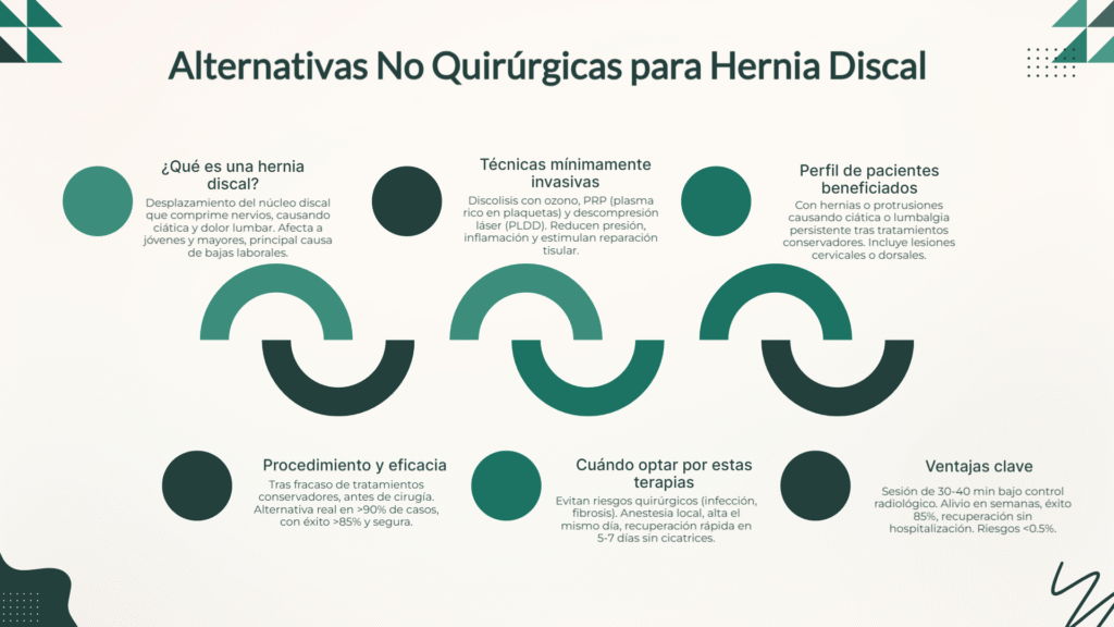Hay opciones de tratamiento mínimamente invasivas que logran influir de manera efectiva en el sistema inmunológico, representando una vía esperanzadora para aquellos pacientes con hernia discal que desean encontrar alivio sin someterse a procedimientos quirúrgicos. Aunque los resultados pueden variar, la evidencia sugiere una alta tasa de éxito y un perfil de seguridad favorable.
